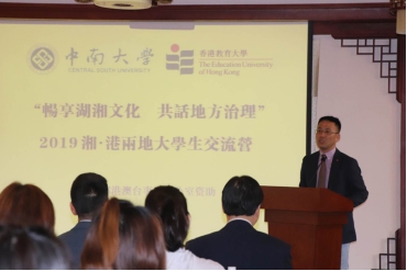 周科朝副校长首先在致辞中表达了对香港教育大学师生的热烈欢迎。他表示,本次交流营有助于进一步加强香港文化与湖湘文化的交流。香港文化博采众长,对年轻人具有较强的吸引力,而湖湘文化开中华文化的先河,近代“敢为天下先”的气魄和“知行合一”的精神具有特别的魅力。改革开放以来,湖湘文化的活跃与创新精神推动湖湘大地发生了翻天覆地的变化。通过对交流营期间将要探访的岳麓山、湖南省博物馆、张家界等文化名地的简短介绍,他表示,中国经济发展仍较不均衡,但有差异才会有动力,希望各位同学在探访湖湘文化多样性的同时开启地方治理的灵感,在全球视野中思考公共管理议题。他希望,各位同学多去体察民情,站在更高的视野思考,积累起中华民族兴旺发达的自信心,在探访与学习中加强两地文化交流,为民族复兴积累力量。最后他祝愿交流营的同学能够在活动中开心快乐有所获,成为文化交流与区域交流合作的使者,预祝本次交流营圆满成功。