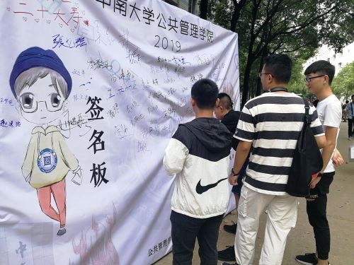 8月28日下午6点,学院分团委、学生会的成员就做好准备工作,将迎新所需物资搬运到指定地点。8月29日上午7点,迎新人员到达原先分配地点,迎新工作正式开始。新生到达迎新点后,工作人员引导新生进行签到活动,随后为19级萌新们送上精心准备的卡套及文件袋等精美小礼物。同时,迎新点准备了饮用水,迎新人员为远道而来的新生及家长送上入学后的第一份清凉,同时为新生及家长解疑答惑。为使迎新活动多元化,我院设置了新生签名墙等,让新生在签名墙上留下到达中南的第一个名字,并拍照留影,留下第一份美好的回忆。