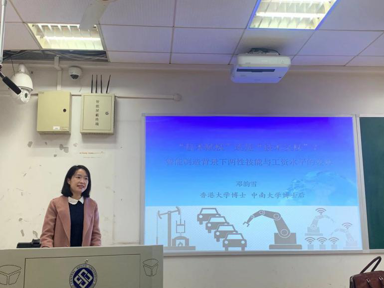 10月22日下午,由yl6809永利科研部主办、我院研究生会承办的中南讲堂·人文论坛系列讲座之“技术赋权”还是“技术父权”?——智能制造背景下两性技能和工资水平的差异,在科教北楼406室举行。本次讲座由我院李斌教授主持,我院博士后邓韵雪老师应邀担任本次论坛的主讲嘉宾,我院社会学系主任潘泽泉教授、彭远春副教授、颜敏副教授、谢新华副教授、博士生、研究生及本科生均聆听了此次讲座。