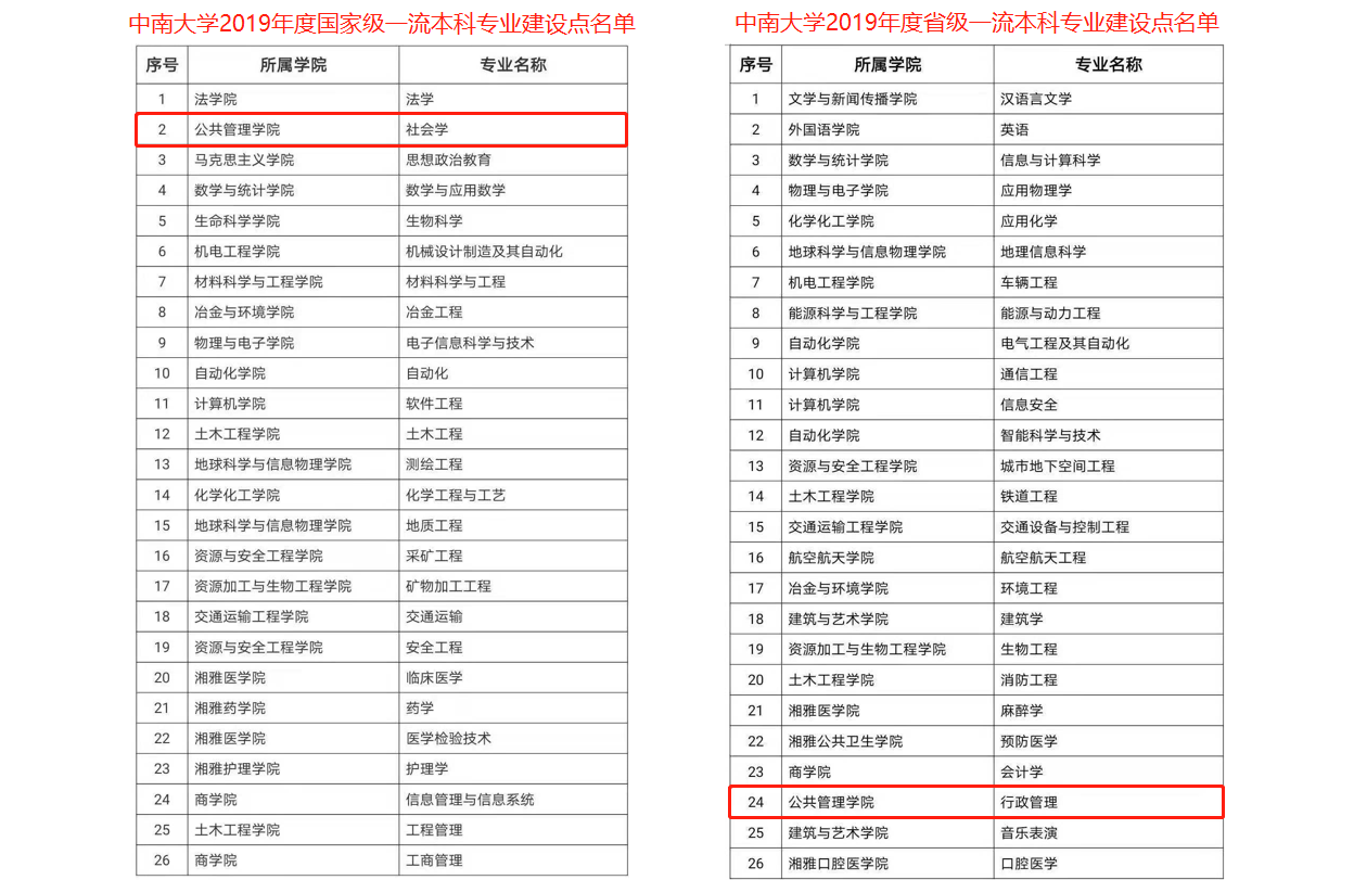 2019年12月31日,根据教育部办公厅《关于公布2019年度国家级和省级一流本科专业建设点名单的通知》(高教厅函[2019]46号),我院社会学专业被认定为国家级一流本科专业建设点。2019年6月,湖南省教育厅公示了2019年湖南省一流本科专业建设点评审结果,我院行政管理专业被认定为省级一流本科专业建设点。