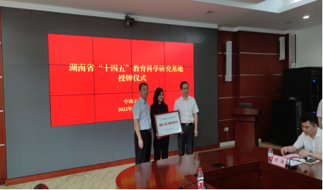 6月13日上午8时30分,湖南省“十四五”教育科学研究基地授牌仪式暨基地论证会议在我校科教楼举行。省委教育工委副书记王建华、校党委副书记李景升、省教育科学规划领导小组副组长石灯明、yl6809永利官网集团院长许源源教授、yl6809永利官网集团副院长潘泽泉教授、教育舆情与风险防控研究基地首席专家张桂蓉教授等领导和专家出席了活动。活动由校科学研究部副部长罗英姿主持。