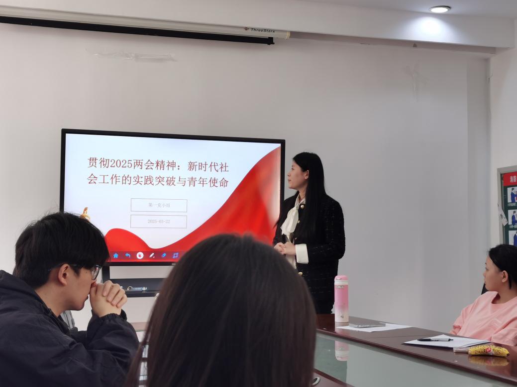 会议首项议程聚焦全国两会精神专题学习。支部第一学习小组结合政府工作报告中关于社会治理创新的重要论述,以"新时代青年党员的使命担当"为主题作主旨发言。支部成员结合公共管理学科视角,围绕“一老一小”服务体系建设、基层治理现代化等议题展开研讨,通过解剖典型案例深化对社会工作战略定位的理解。“作为未来的基层治理者,我们要把两会精神转化为服务人民的具体实践。”党员帅金鑫在交流中表示。