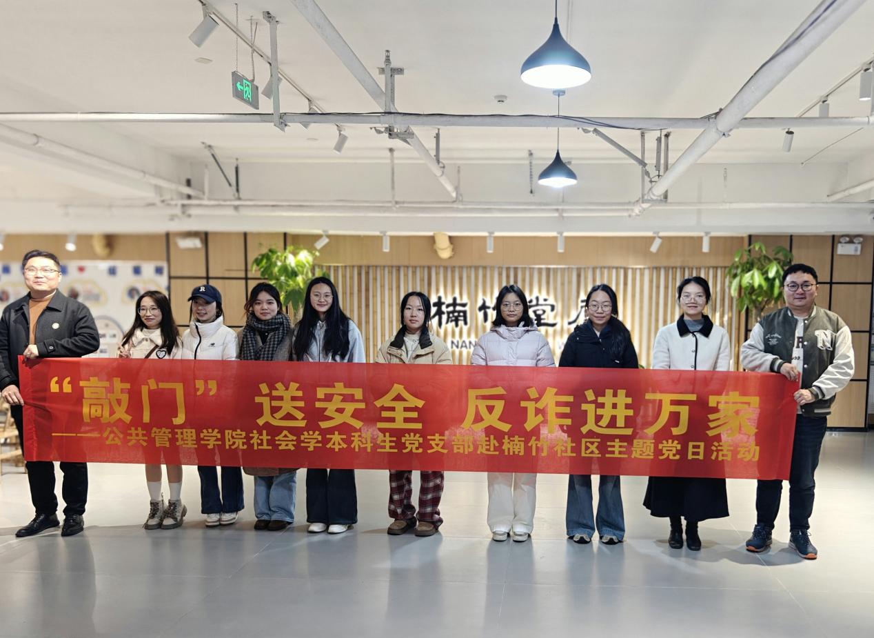 为提升党员服务群众能力,学习基层治理经验,2025年12月16日,yl6809永利官网集团社会学本科生党支部赴长沙市天心区暮云街道楠竹社区开展“‘敲门’送安全 反诈进万家” 主题党日活动。党支部书记梁慧老师带领本科生党员8人参加,活动分为参观学习和走访宣传两部分。