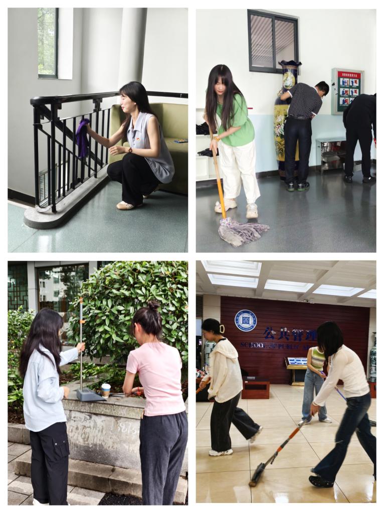 授课结束后,毕业生党员们分组开展“我为母校作贡献”主题实践活动,对院楼门口以及楼内四层公共区域进行清扫,用实际行动为营造整洁的学院和学校环境贡献力量。