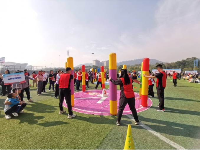 当天上午8点,趣味运动会在庄严的国歌声中拉开了序幕。学院党委书记杨旭东、院长许源源,公管系刘媛、陈文琼、付名琪,社会学系韦晓丹、张晓倩,党政办王晓佳、张莉、王进、岳忠强、孙炎,教务办罗晓洪、艾晓果、李兰、贾晓锋,学工办徐立坤、梁慧、张宇奇等19位老师,组成我院教职工代表队,团结一心、奋力拼搏,依次参加了精打细算、趣味飞盘、鸿运当头、同心协作和屹立不倒等五个项目的比赛。