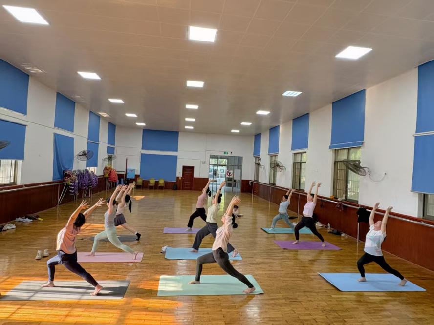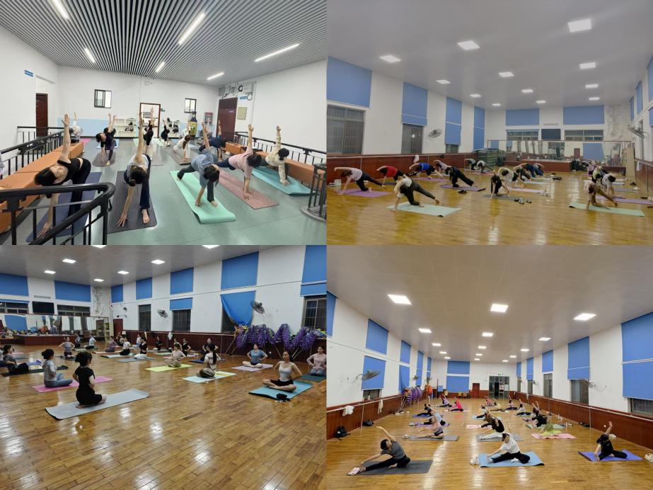 瑜伽课现场,师生们在悠扬乐声中舒展肢体,通过腹式呼吸调节身心。课程特别设置冥想放松环节,帮助师生释放工作和学业压力。参与活动的王同学在课后分享,“每次吸气时感受脊柱延伸,呼气时卸下疲惫,这种专注让我重新找回内心的平静。”活动还吸引了土木工程学院等兄弟学院师生加入,体操房内宁静专注的场面成为校园文化新风景。