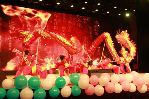 晚上7时,观众陆续入场,现场开始播放暖场视频,三院领导以视频互动的方式送出自己的祝福。倒计时之后,体育教研部带来开场节目《龙腾盛世》,气势威武的舞龙犹如巨笔,徐徐引出晚会第一章。