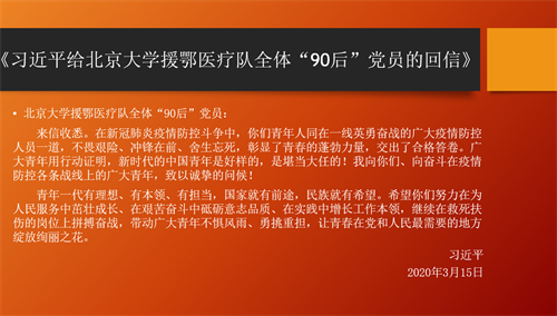 首先,孙老师为同学们深入解读了《习近平给北京大学援鄂医疗队全体“90”党员的回信》,分析了其框架和主要内容,并带领同学们回顾了总书记在不同历史阶段对青年寄予的期望。孙老师指出,疫情当前,在以习近平同志为核心的党中央坚强领导下,中国举全国之力战“疫”,为人民的生命健康筑起坚实“长城”,也以世界所罕见的领导力和组织动员力展现出负责任大国形象,我们看到了党旗在防控疫情斗争第一线高高飘扬。“青春逢盛世,奋斗正当时”,孙老师也期望同学们能脚踏实地,认真学习文化知识,在实践中增长工作本领,也能仰望星空,有休戚与共的责任担当,在复兴征途中书写青春华章。