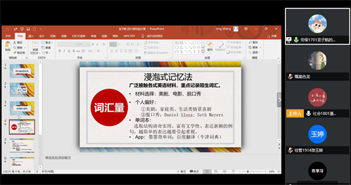4月22日下午4时,我院在腾讯会议平台举行了英语四六级经验分享会。会议邀请本科生17、18、19级龙子航、邵翊铭、张开元、杨甄妮共4位四六级高分学霸分享经验,19级辅导员闵迪老师和19级全体同学参会,院学生会学术部部长潘琴同学主持。