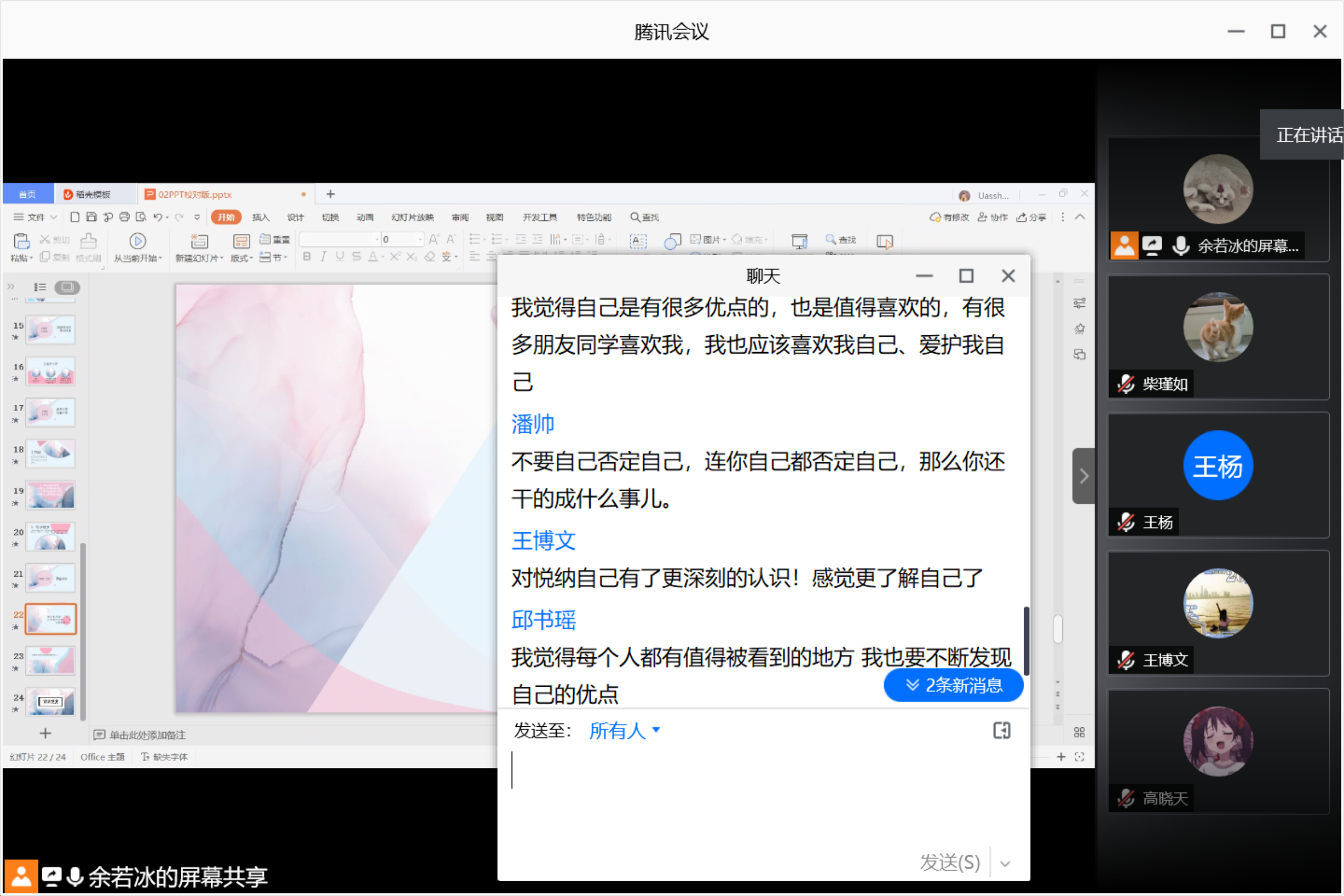 8月10日晚上8时,心理健康教育线上公益小课堂正式开课,课程时间从10日至15日,均为晚8时开始,每节时长约1小时。虽然团队在课题选择和授课方式上都做足了准备,但在开课之初,仍然遇到了同学们不愿敞开心扉的难题。第一节课的“出师不利”让团队成员感到挫败。但是在短暂的低迷后,团队成员迅速讨论解决方案,在增加互动促进师生情谊上达成共识,并加班加点准备第二节课的互动游戏。第二节课在团队成员的紧张期待中到来,经过课前的暖场互动,同学们渐渐熟络大胆起来,发言也开始活跃,这让团队成员都松了一口气:“一切终于迈上正轨。”