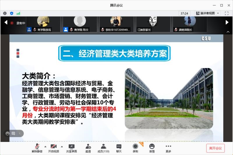 9月23日晚7时30分,我院联合商学院在腾讯会议平台顺利召开经济管理类2020级本科新生家长会。会议由商学院学工办主任李苑主持。商学院党委书记任胜钢、院长龚艳萍、党委副书记陈迎明、副院长李大元、教管中心主任黄玖祎,我院党委书记刘迪、院长许源源、副书记耿贵斌、副院长董海军、公管系刘媛教授及赵书松教授,经管类本科2020级辅导员闵迪、陈文、谢虎出席会议,全体经管类2020级本科生家长参会。