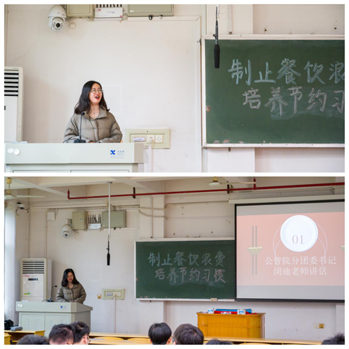 下午2时,三个团支部在世纪楼A404教室开展了室内活动。为了加深同学们对“制止餐饮浪费,培养节约习惯”主题的了解,本次活动邀请了我院分团委书记闵迪作为特别嘉宾参加。闵老师首先讲述了历史上勤俭节约的名人小故事,并结合新冠疫情防控、国际贸易形势等时事深刻阐述了“粮食安全、始终把饭碗端在自己手上”的重要性,告诫同学们“要牢记历史,在吃饭问题上不能得健忘症,不能好了伤疤忘了疼。”学生们纷纷表示,要从自身做起,杜绝餐桌上的浪费,让勤俭节约体现在自己的一言一行、一举一动,让“厉行节约、反对浪费”成为校园新风尚。