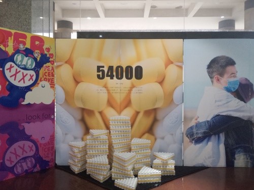 值得一提的是,会场展出了一组药瓶装置,装置旁边的背景墙上标注着一个大大的阿拉伯数字——“54000”,据会场工作人员介绍,这组装置意味着一个20岁青年若是不幸感染艾滋病,假设其平均寿命为70岁,那么这一生他将需要接受1800瓶的药物治疗,也就是服用54000颗药物。