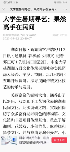 我院的社会实践“搴光揽文”团队凭借其独到的研究角度、科学的实践方法、丰硕的实践成果得到《新湖南》等媒体的宣传报道,获得了我校的推荐,成功进入中国青年报社举办的“寻找全国大学生百强暑期实践团队”活动的网络投票阶段,投票结果将占最后结果的40%。投票方法是在微信搜索并关注“中国青年报”微信公众号,在对话框内输入编号612538,即为投票成功。