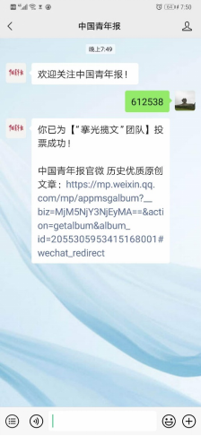 在对“搴光揽文”小队的实践成果和未来规划有所了解之后,你是不是也被灿烂的湖湘民间文艺所感染了呢?只要在微信搜索并关注“中国青年报”公众号,在对话框内输入编号612538,就可以为他们投上宝贵的一票,为湖湘传统文化传递自己的支持啦!