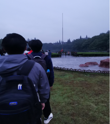 虽然天气阴冷,但我院学子在6:30已进入图书馆前坪,集合完毕,各班级快速有序分站两列,在破晓时分静待升旗仪式的开始。辅导员梁老师到达前坪后,提醒各班班委清点人数。