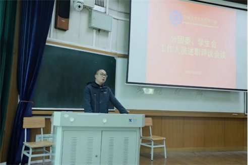 述职开始,学生工作人员从政治态度、道德品行、学习成绩、工作成效、纪律作风共5个方面进行汇报。公管院第十四届分团委成员王晓彤、刘胜蕊、董馨媛、林白平、王中方、游丛瑞、黄依婷、陈永雪、李萌芽依次上台进行述职。
