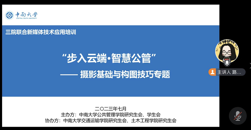 为充分发挥新媒体技术融入个人成长的发展优势,提升学生骨干的新媒体技术运用水平与业务能力,2023年7月4日晚7点,我院与交通运输工程学院、土木工程学院三院共同举办“步入云端·智慧公管”新媒体技术应用培训——摄影基础与构图技巧专题培训。团中央青年发展部创青春视讯工作成员、湖北省电影家协会会员路博予受邀主讲,培训讲座采用线上腾讯会议方式,培训惠及更多学生,影响力显著提高