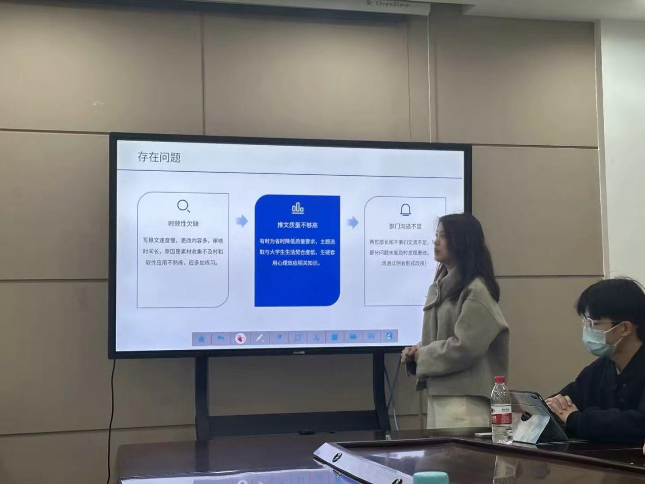 会议伊始,心助会四位部长分别对上学期本部门的工作进行了总结,并针对存在的问题提出了改进建议。各部门还就本学期的工作计划和部门发展规划进行了详细汇报,说明各部门在该学期期望达成的工作目标和具体措施,展现了心助会在活动策划、团队建设、未来发展等方面的创新思路。