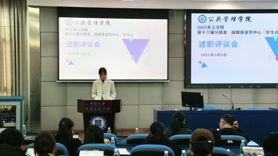 为进一步加强学院分团委、融媒体宣传中心、学生会组织建设,提高组织成员思想政治素质和工作能力,3月9日上午10时,我院在公管楼404召开第十六届分团委、融媒体宣传中心、学生会述职评议会。我院党委副书记耿贵斌、院分团委书记梁慧出席此次会议,院分团委、融媒体宣传中心、学生会主席团全体成员及各部门负责人共计21人参会述职,64位学生代表参会听取报告并开展评议。