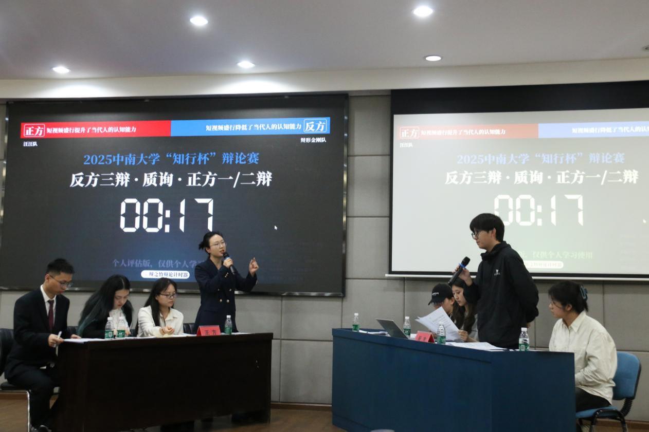 本次辩论赛采取双持赛制,三支队伍围绕一个辩题进行两两组合的三场比赛,每支队伍都饰演一次正方和反方。正方辩题为“短视频盛行提升了当代人的认知能力”,反方辩题为“短视频盛行降低了当代人的认知能力”。