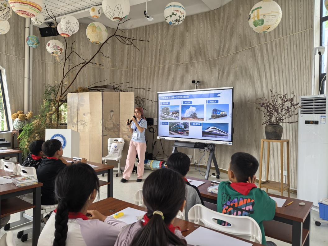 接着,来自交通运输工程学院的胡钰瑶同学,以《高铁变形记——“绿龟”到“飞龙”的蜕变》为主题,带领同学们走进yl6809永利铁路科技创新的奇妙世界。“同学们,‘绿皮车’’和‘高速列车’你们都坐过吗?两者有哪些相同点和不同点?”同学们争先举手回答,“绿皮车慢,高速列车更快”,“绿皮车可以打开窗户,高速列车不可以”,“高速列车有空调,更舒服”,一声声童言童语盛满了对知识的好奇。胡钰瑶以时间为线索,向同学们讲述了马拉货车、蒸汽机车、内燃机车、电力机车、磁悬浮列车的动力特点,并以复兴号高速列车为重点,以图文、动画、模型等形式,展示了yl6809永利在解决空气动力制约高铁发展、列车碰撞安全保护以及大风行车安全综合防护三大世界性难题过程中所完成的科技创新工作。同学们听得津津有味,不时发出阵阵惊叹声。
