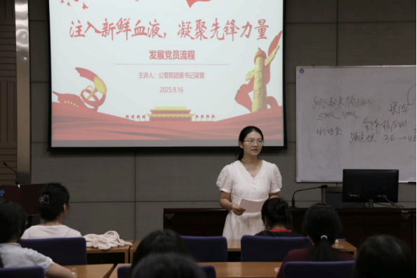 随后,梁慧老师为各位团支书讲解“注入新鲜血液,凝聚先锋力量”主题团课。她围绕党员发展全流程进行了讲解,提出同学们应加强政治意识,提高专业能力和综合素质,保持自身先进性。同时,她也对团支书工作提出更高要求,期望各班团支书不断提高思想觉悟和政治素养,强化责任心,严格按推优入党流程开展工作,确保团推优工作的公平性。此外,她要求团支书与班长加强联系,在日后将团日活动与班级活动进行有机结合。