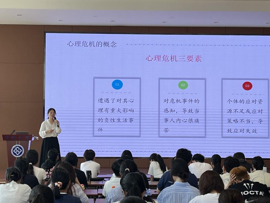 接着,梁老师从朋辈心理互助、心理危机识别与预防等方面展开讲解,深入浅出地分析了大学生可能面临的心理适应风险,介绍了学校心理健康中心的服务内容,以及“校级、院级、班级、朋辈”四级心理防护体系。她特别强调了朋辈心理互助者在倾听、宣传和信息反馈中的重要作用,鼓励同学们积极利用身边心理资源,以健康心态面对大学生活。