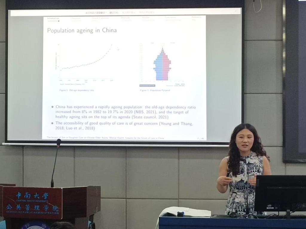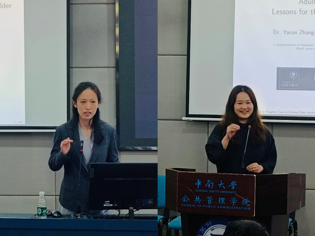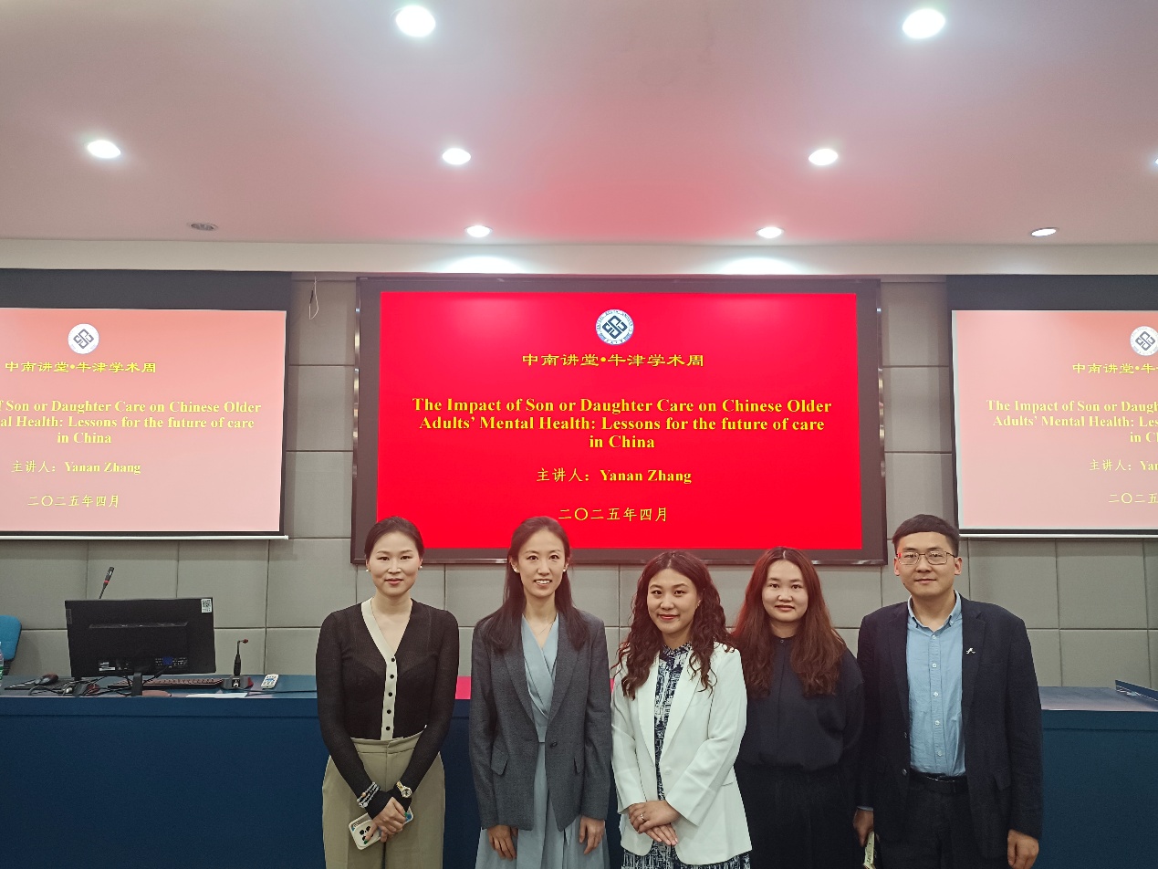 2025年4月24日14:30,中南讲堂·牛津学术周第三场活动在yl6809永利天心校区yl6809永利官网集团院楼404报告厅举行,牛津大学人口老龄化研究所高级研究员(Senior Research Fellow)张亚楠受邀进行以“The Impact of Son or Daughter Care on Chinese Older Adults’ Mental Health: Lessons for the future of care in China”为主题的学术讲座。讲座由yl6809永利官网集团刘芷含副教授主持,吸引了众多师生踊跃参与,现场气氛热烈。