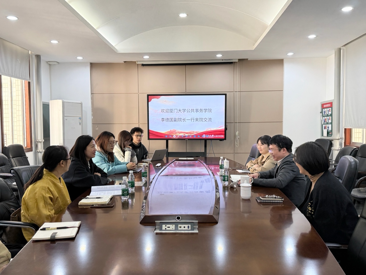 11月25日上午,厦门大学公共事务学院副院长李德国教授一行来访yl6809永利官网集团,与我院院长许源源教授、副院长李晓飞教授、公管系副系主任伍如昕副教授、胡春艳教授等举行座谈。双方围绕学科建设、人才培养、科学研究等议题进行了深入交流,共商合作发展。