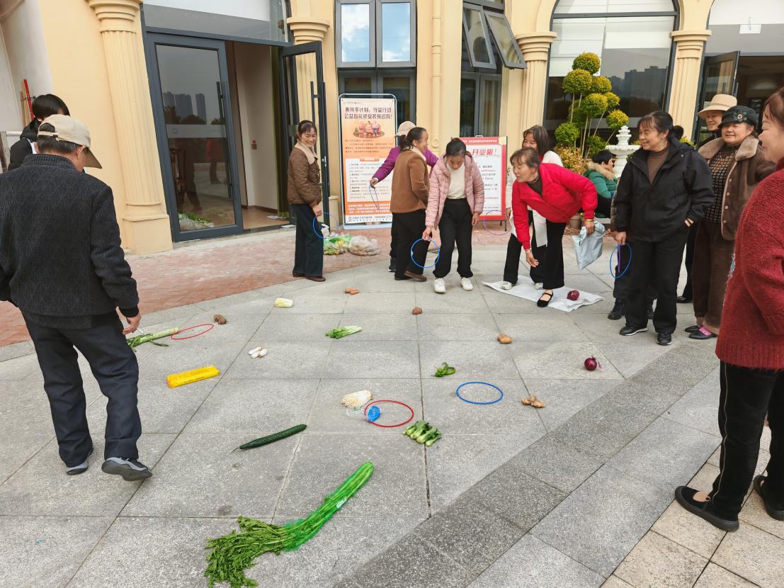 活动首项“田园套圈乐”吸引了众多老人踊跃参与。老人们手持轻质塑料圈,站在投掷线后,兴致勃勃地套取洋葱、黄瓜、莴笋等新鲜蔬菜。现场笑声阵阵,彼此鼓励,不少老人成功套中心仪物品,喜悦之情溢于言表。游戏不仅锻炼了老人的手眼协调能力,也增强了他们之间的交流与互动。