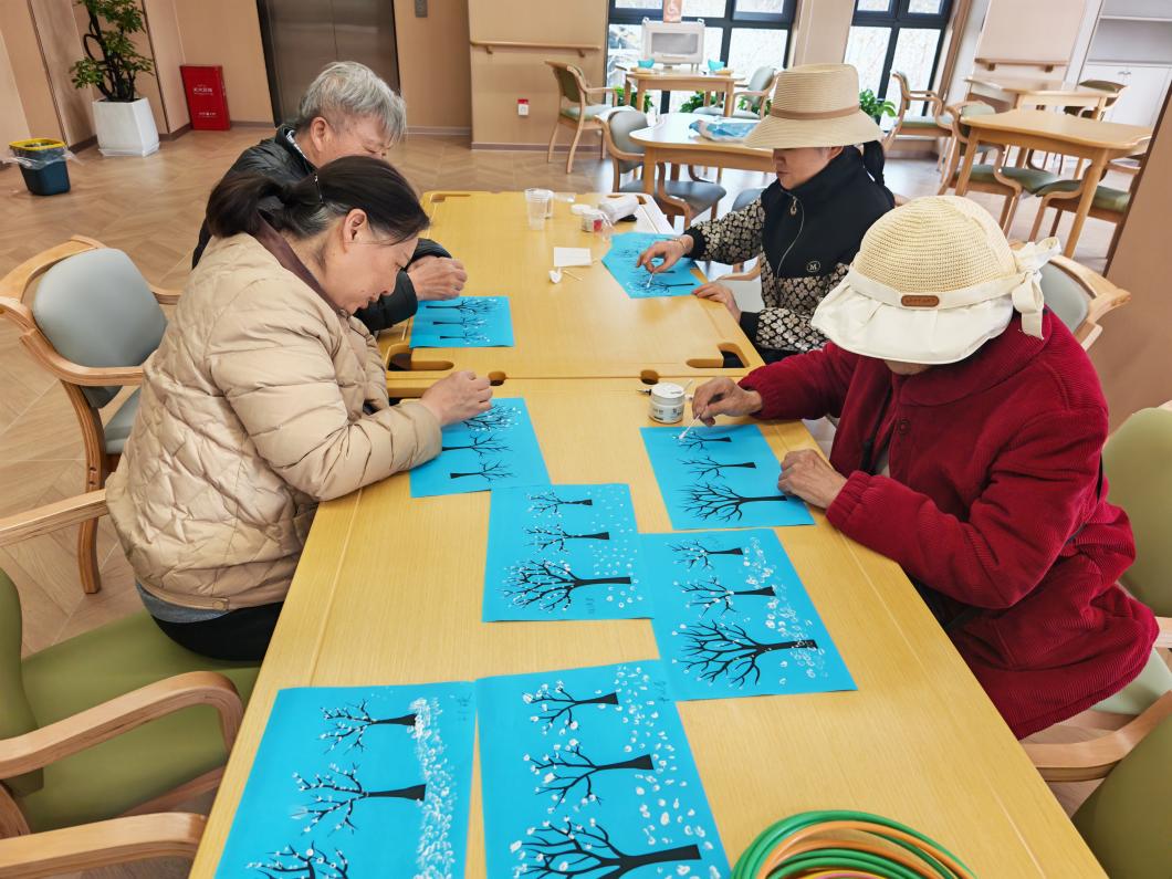 随后进行的“手绘时光”手工环节同样精彩。在两位同学的细心讲解与协助下,老人们用彩色卡纸和棉签创作出各具特色的绘画作品。过程中,大家互相学习、分享心得,现场洋溢着浓厚的艺术氛围与成就感。许多老人表示,这样的活动既动手又动脑,让人心情愉悦。