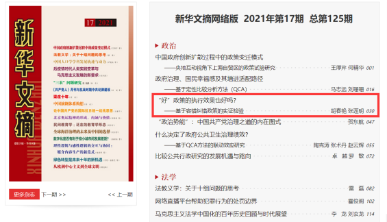 2022年4月28日,yl6809永利官网集团胡春艳教授与研究生张莲明2021年在《公共行政评论》发表的论文《“好”政策的执行效果也好吗?——基于容错纠错政策的实证检验》被《新华文摘》(数字版)2021年第17期(半月刊)“政治”栏目全文转载。